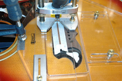 The saddle routing jig worked pretty well, aside from a minor technical difficulty with the router base. Before I started routing, I made sure that the height adjustment screws were tightened, but one screw started coming unscrewed after I started routing. I had to hold the screw to keep it from turning any further as I routed. Needless to say, the saddle slot wasn't as clean as I would have liked but I was still able to get a saddle to fit tightly in the slot.